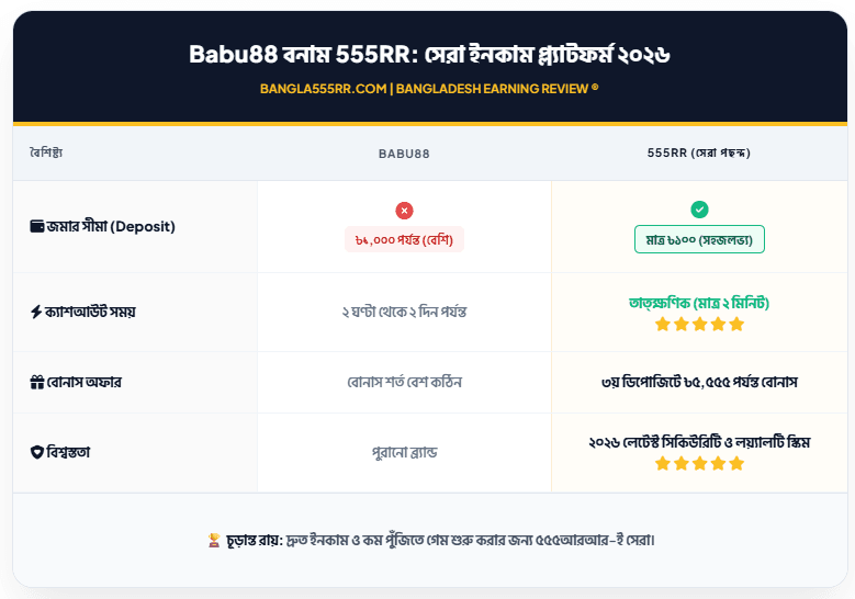 Babu88 বাংলাদেশে ক্রিকেট বেটিং এবং লাইভ ক্যাসিনোর জন্য বেশ আলোচিত একটি নাম। কিন্তু ২০২৬ সালে অনলাইন ইনকামের দুনিয়া অনেক বদলে গেছে। এখন মানুষ চায় কম পুঁজিতে বড় জয় এবং দ্রুত ক্যাশআউট। কেন বর্তমানে প্রচুর ব্যবহারকারী বাবু৮৮ ছেড়ে ৫৫৫আরআর (555RR)-এর দিকে ঝুঁকছেন? চলুন বিস্তারিত তুলনা দেখে নিই।