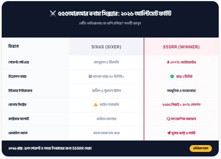 আপনি যদি জটিল এক্সচেঞ্জ সিস্টেমে অভ্যস্ত হন তবে সিক্সার আপনার জন্য। কিন্তু আপনি যদি সহজ গেমপ্লে, দ্রুততম পেমেন্ট এবং ২০২৬ সালের সেরা অনলাইন ইনকাম নিশ্চিত করতে চান, তবে ৫৫৫আরআর (555RR)-ই হলো একমাত্র বিশ্বস্ত নাম।